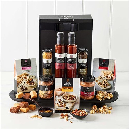 • Beef Rub 165g, Chicken Rub 150g, Popcorn Crunch 125g, Savoury Nuts 120g and assorted Fudge 125g. Presented in a hamper box.