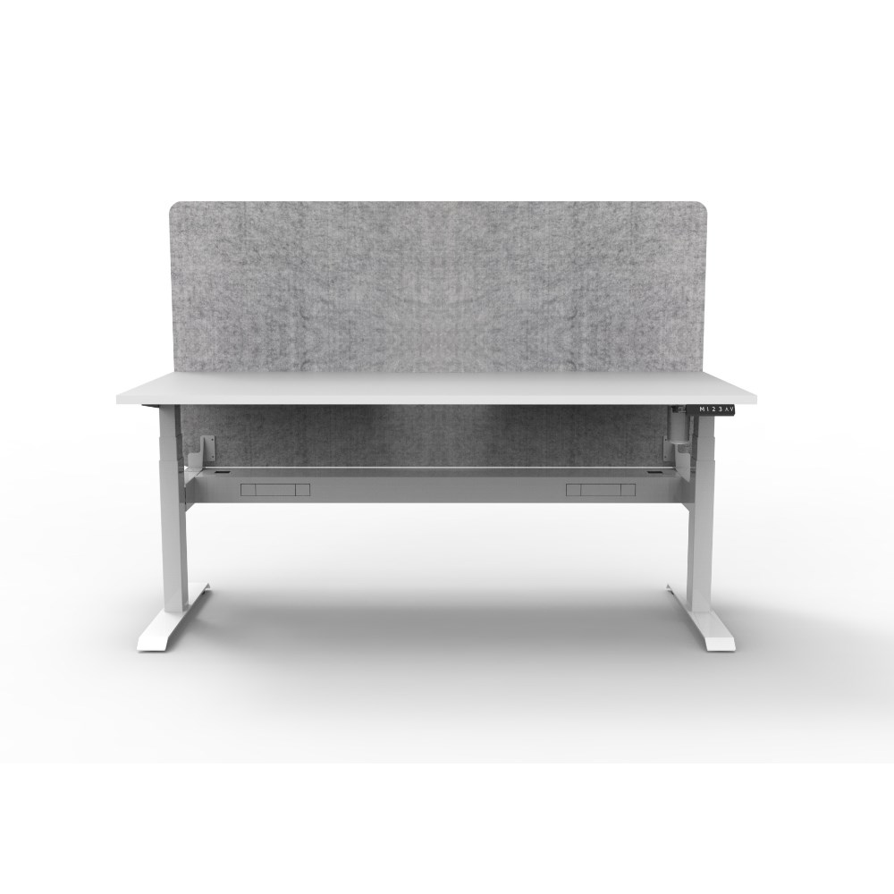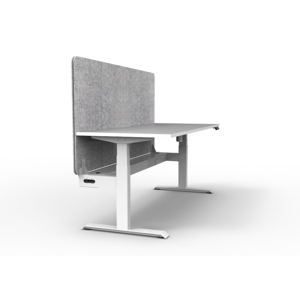 • Electric height adjustable single sided workstation with Natural White top and White Satin frame, Grey Eco screen and cable tray.